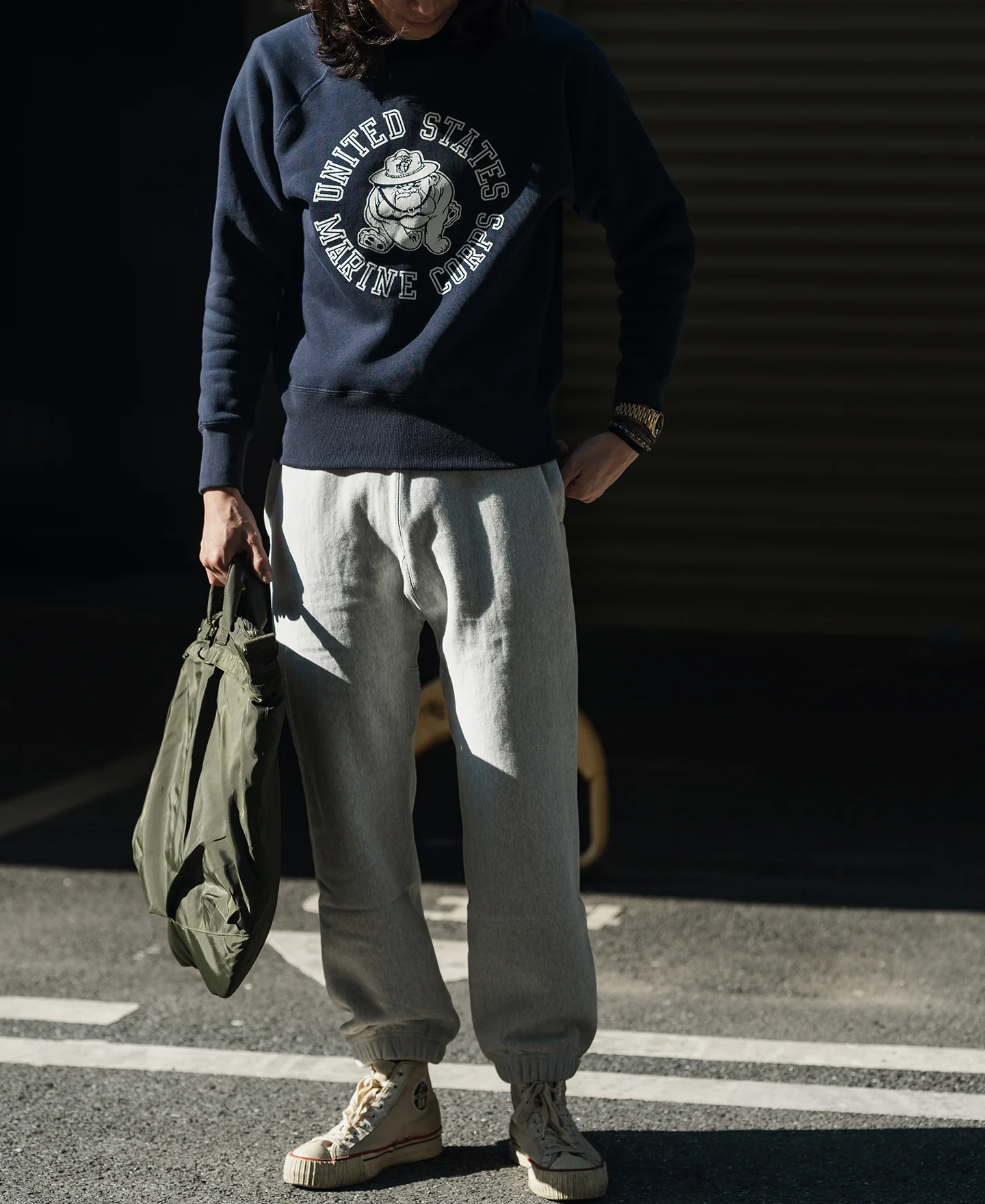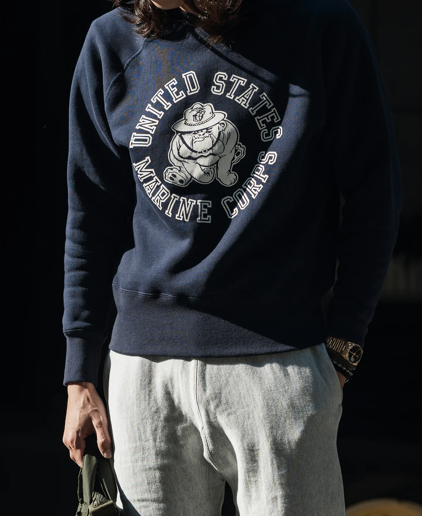 Based on the fleet store sweatshirts available to service members from the 1980s-1990s, this piece features the classic Marine running Devil Dog print.